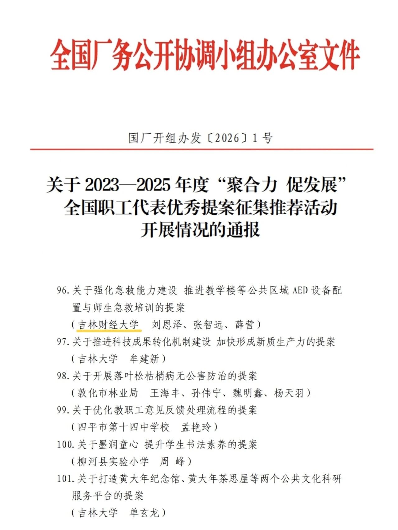 近日,全国厂务公开协调小组办公室发布《关于2025年度“聚合力促发展”全国职工代表优秀提案征集推荐活动开展情况的通报》(国厂开组办发〔2026〕1号)。由我院教职工刘恩泽、张智远、薛营联合提交的《关于强化校园急救能力建设,推进教学楼等公共区域 AED 设备配置与师生急救培训的提案》成功入选全国优秀提案名单,是吉林省属高校中唯一获此殊荣的提案,成为全国各级工会组织、企事业单位和广大职工学习借鉴的典范。这是该提案在2025年斩获吉林省优秀职工代表提案一等奖后,又进一步实现了从省级奖项到国家级奖项的重大跨越,充分彰显了我院教代会代表撰写提案的前瞻性、科学性与普适性。这既是对提案质量的高度肯定,也是对民主管理工作成效的集中体现。